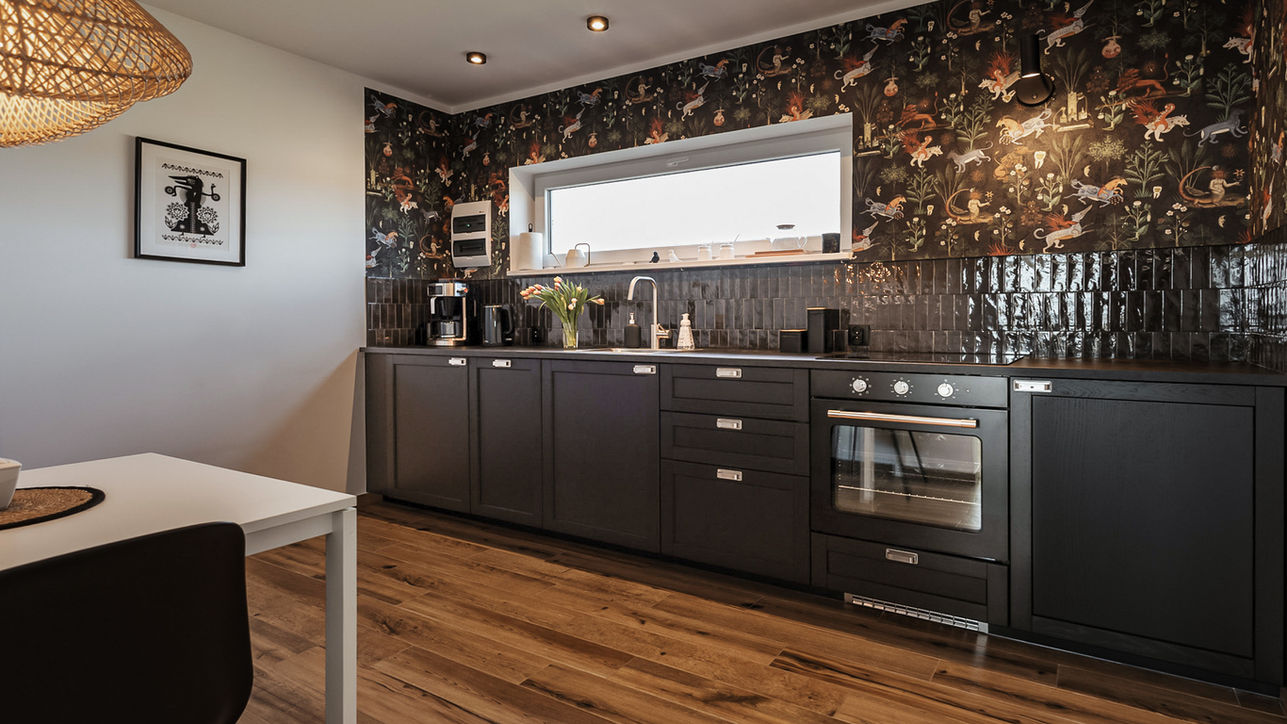 W kuchni zmywarka, lodówka z zamrażarką, piekarnik z płytą elektryczną, zastawa stołowa, garnki, ekspres do kawy, kawa i herbata
